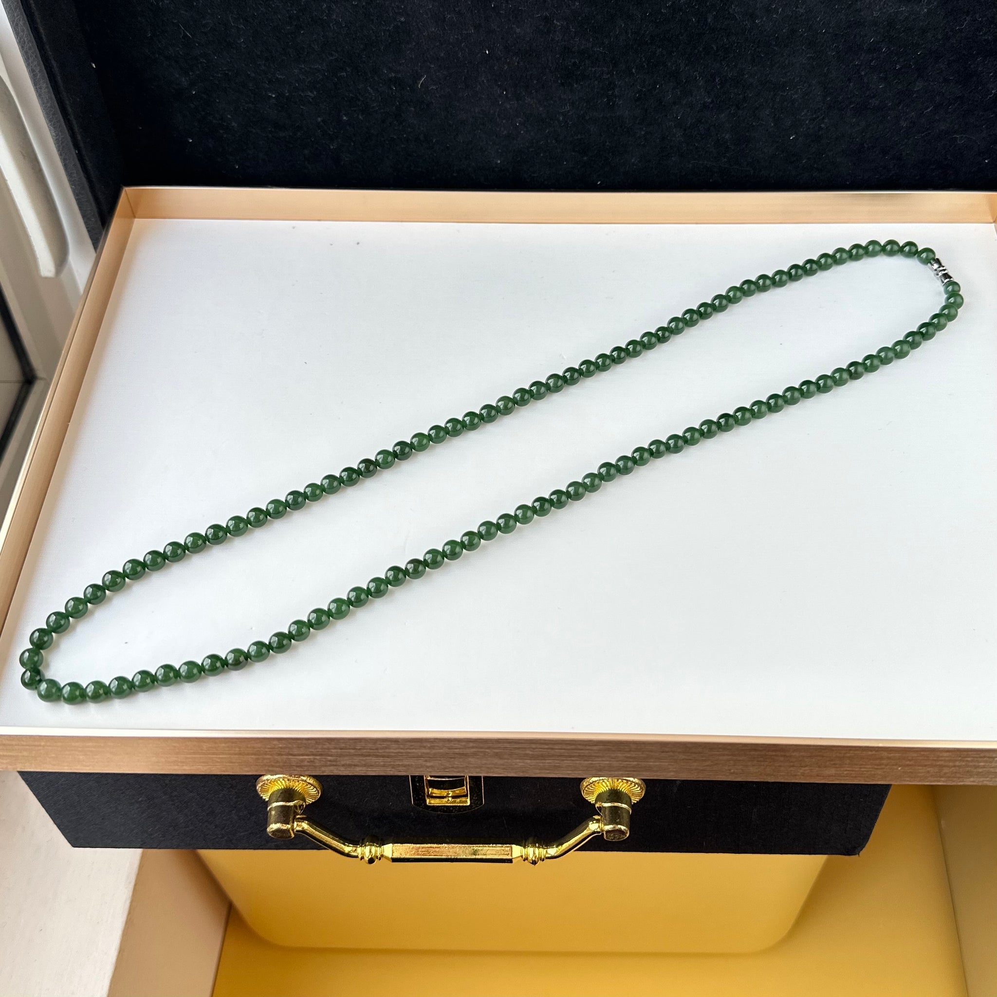 This remarkable nephrite necklace epitomizes exceptional quality in every aspect. Its striking, intense green hue perfectly mirrors the vivid color showcased in the photos, while its brilliant lustre adds an enchanting allure. Remarkably pure, it is free from any impurities like the common black spots often found in nephrite, ensuring a flawless appearance. The necklace maintains a consistent level of excellence throughout, whether in color or quality, promising a truly remarkable piece.
