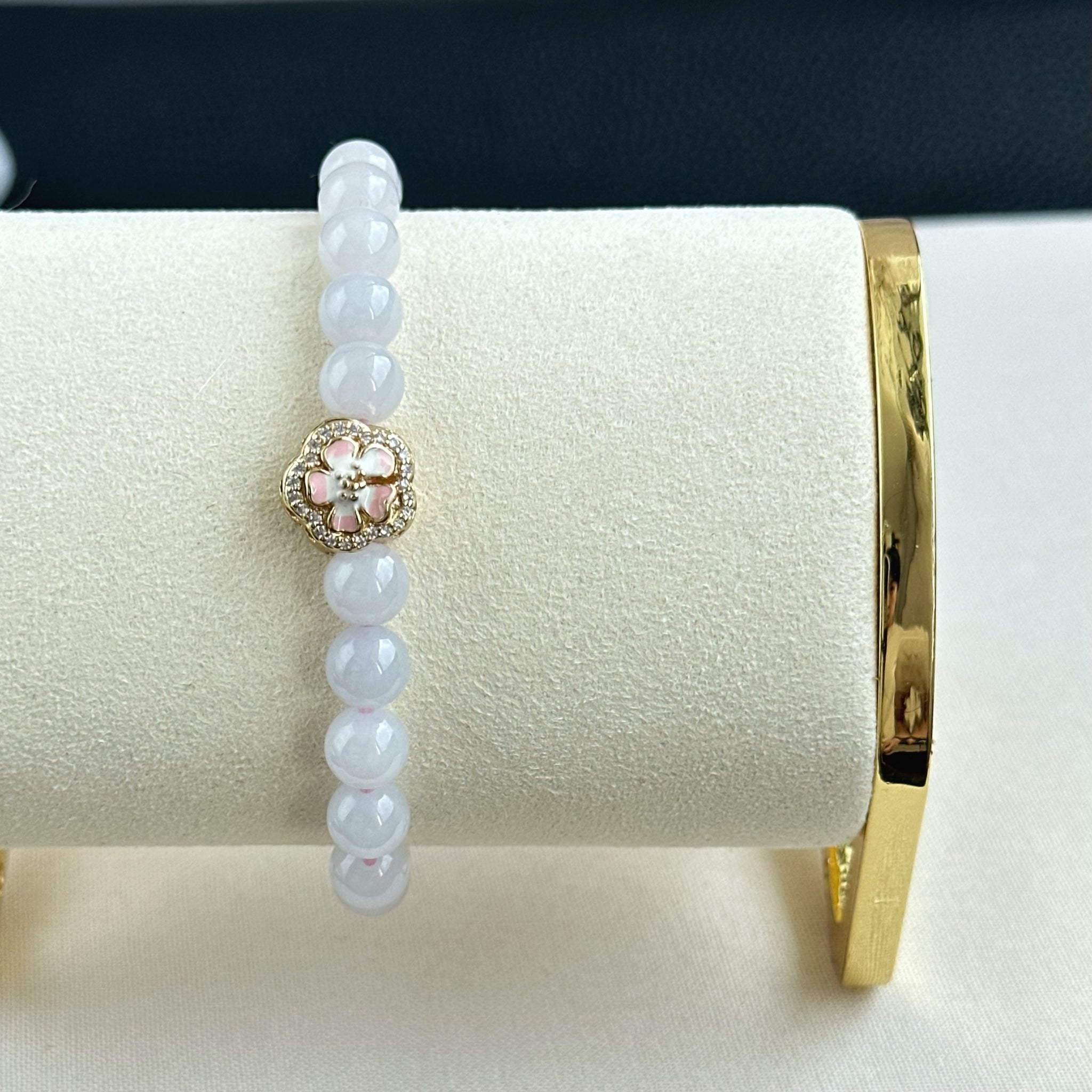 At the heart of this piece lies a meticulously crafted gold-plated floral bead, sourced from Kiwa Seisakujo, Japan’s renowned accessory artisan brand. With its intricate detailing and exquisite enamel accents, the bead adds a refined touch, symbolizing purity, renewal, and spiritual awakening—qualities deeply associated with the lotus flower.