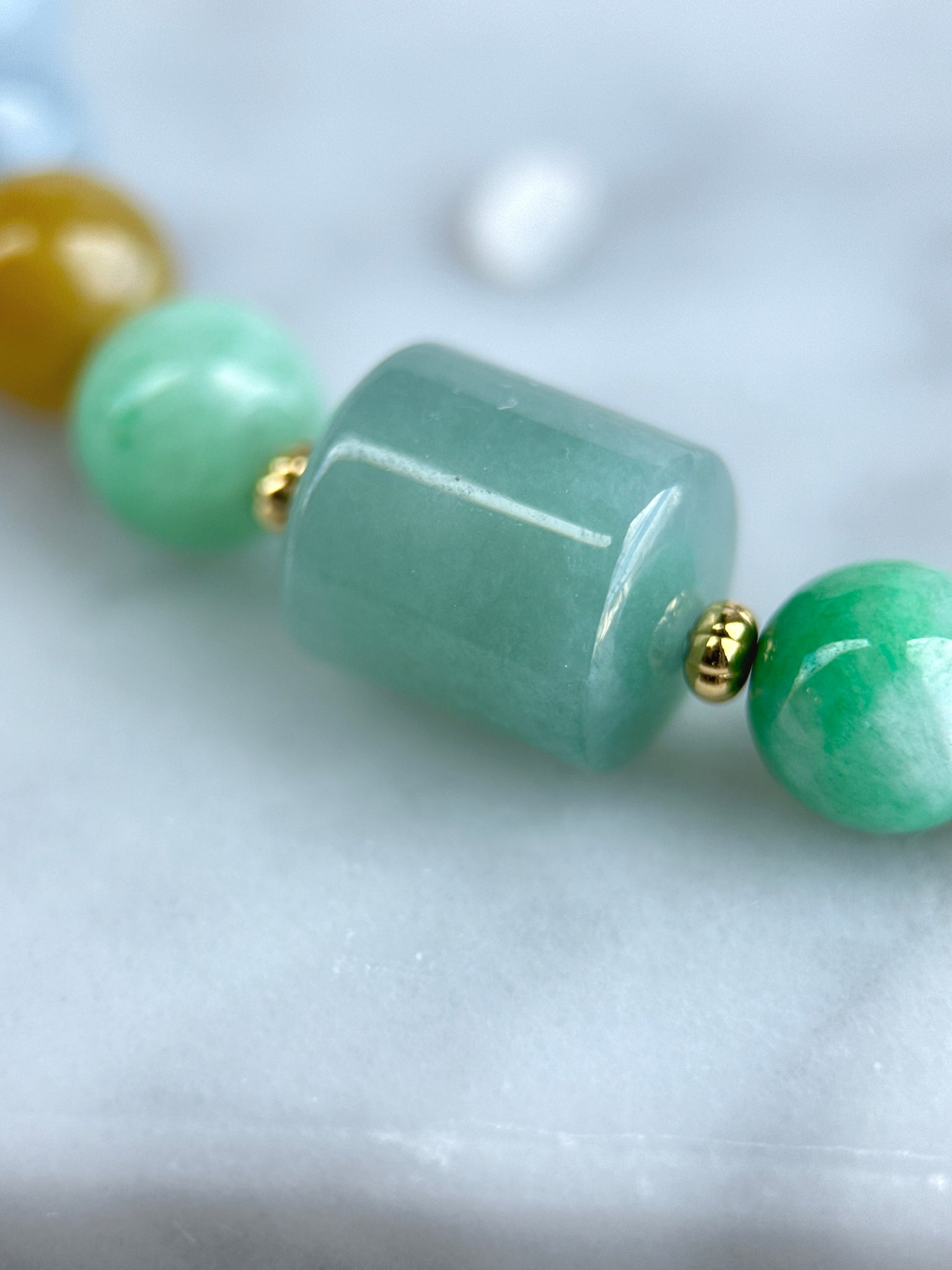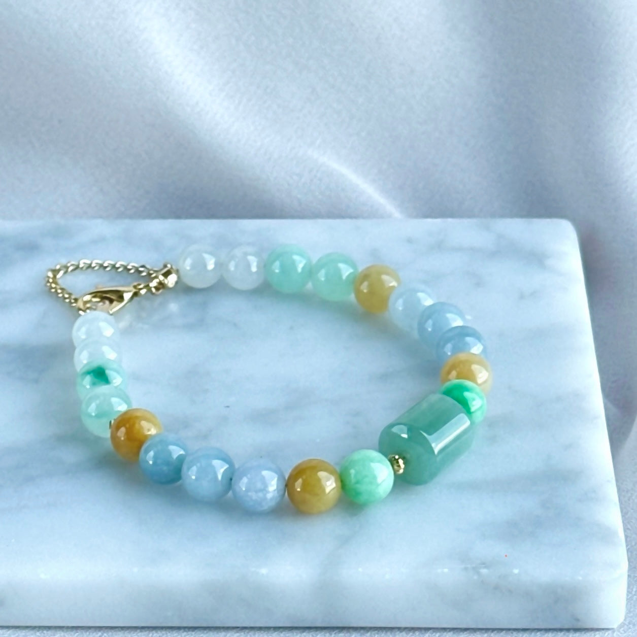 The Jade of Abundance Bracelet is a stunning multi-colored piece, symbolizing wealth, health, fortune, and happiness. Crafted from highly translucent jade beads, each stone represents a different treasure in life, bringing balance and prosperity to its wearer. With its radiant mix of hues, this bracelet is not only a captivating accessory but also a meaningful reminder of abundance in all forms. Perfect for those who appreciate the elegance and symbolism of jade.