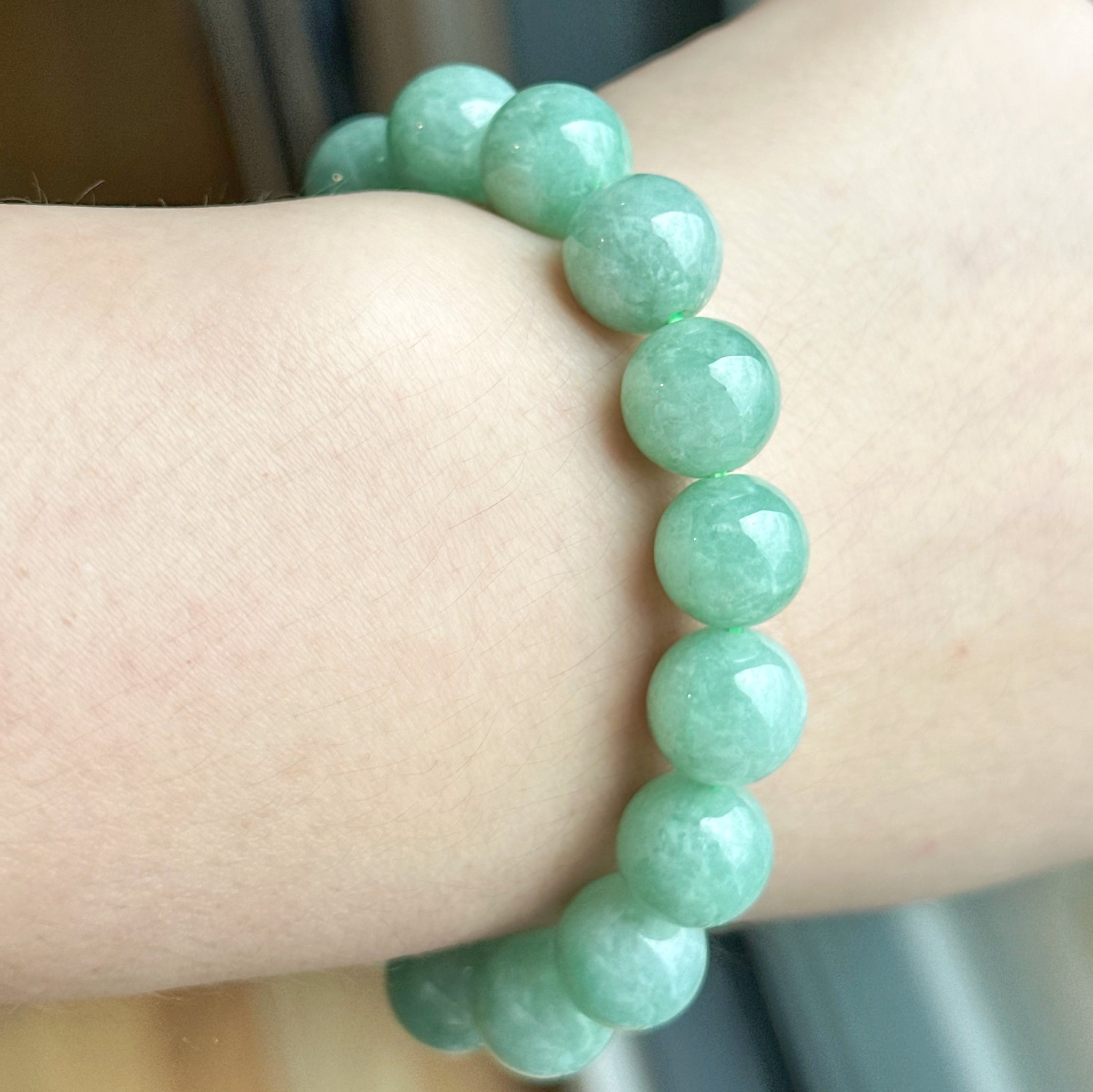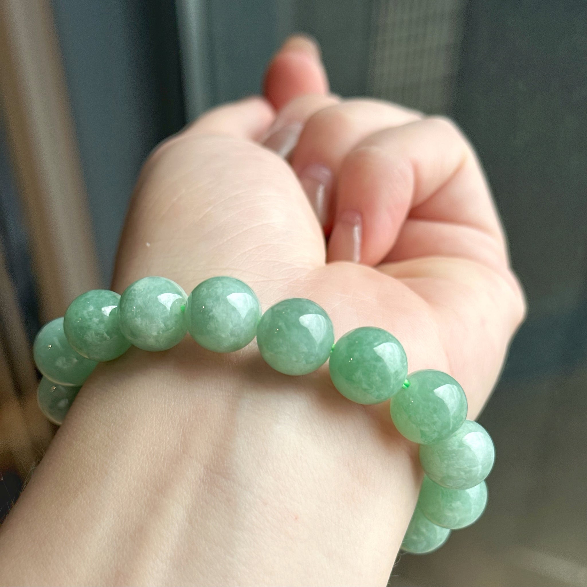 Unique characteristic: These full green beaded bracelets are highly translucent and watery. The beads are finely carved and polished.