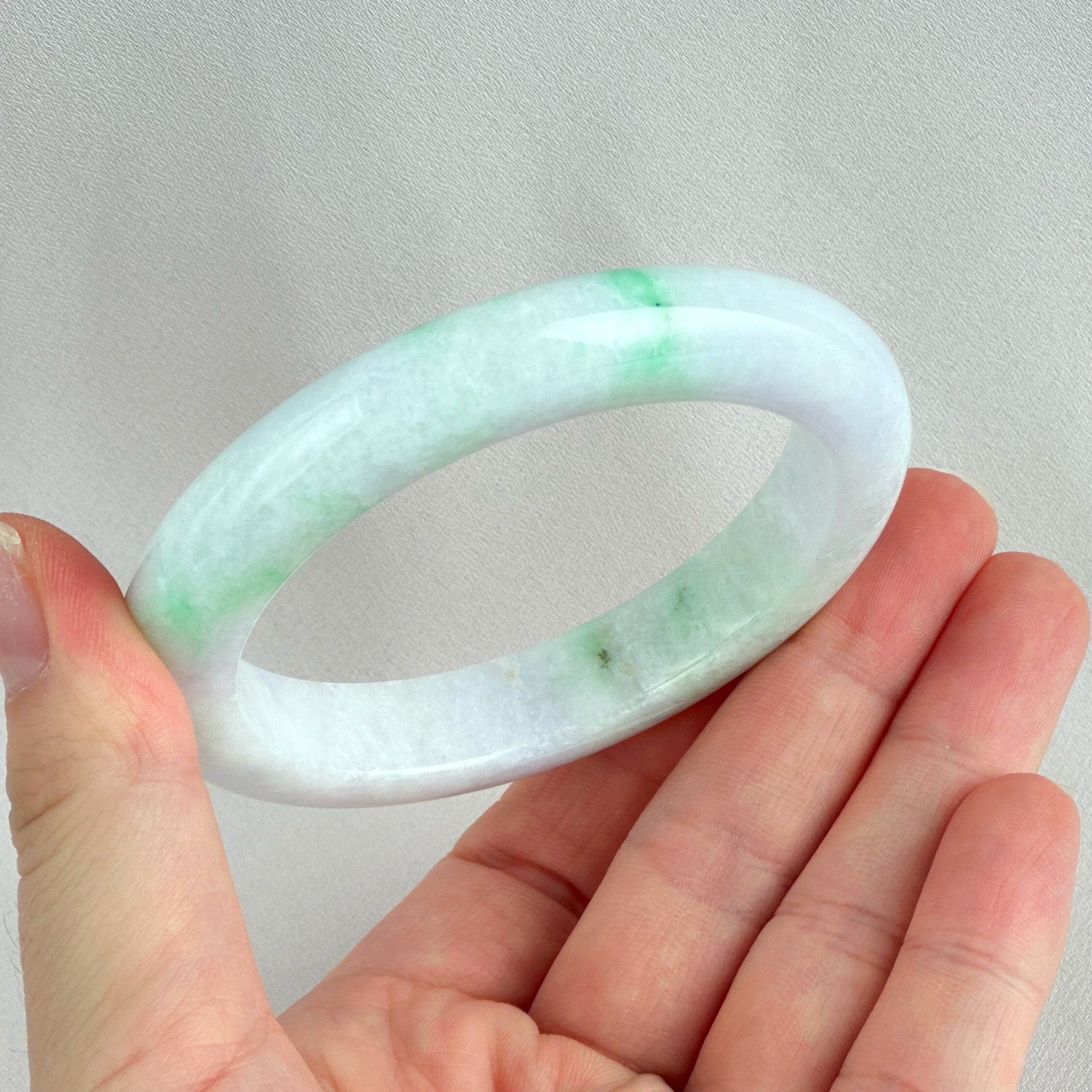 Unique characteristic: This spring colour bangle is the symbol of beauty. This Spring Colour bangle is the art of nature and it is a prized colour which lavender purple meets green in a jadeite bangle. Bangle like this is definitely a must have piece by avid jade collector.