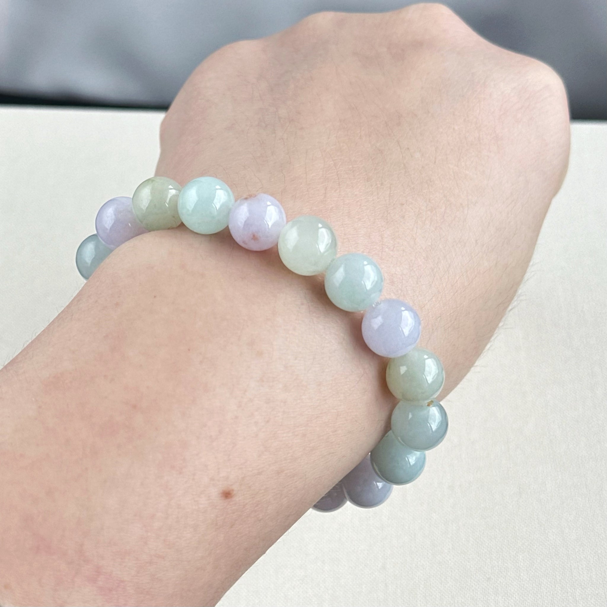 Each bead in this bracelet is carved from the same jadeite stone—a true rarity where nature effortlessly blends multiple stunning pastel hues into a single piece. It is exceptionally uncommon to find a jadeite stone that naturally displays such a harmonious mix of colors, making this bracelet a one-of-a-kind treasure. Adding to its uniqueness, select beads feature natural red jadeite specks, nature’s own signature, enhancing its character and exclusivity.