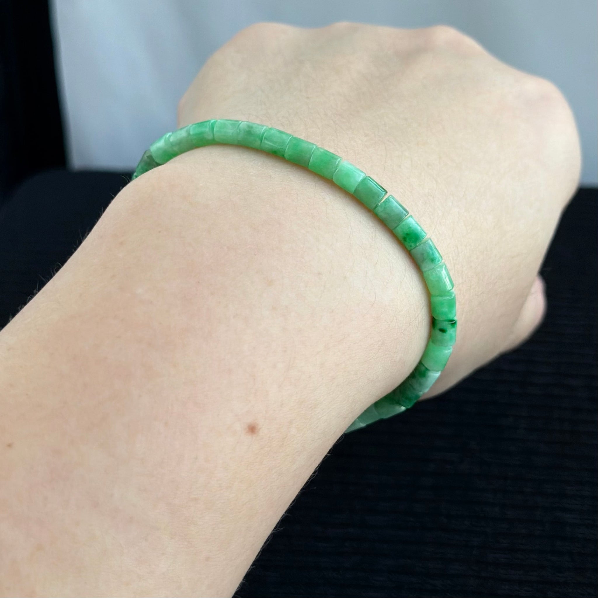 This bracelet features finely polished barrel-cut jadeite beads in luminous shades of fresh bamboo green. Each bead reveals a natural interplay of light and tone — from pale leaf green to deeper forest veins — creating a tranquil visual rhythm. The slight spacing between beads allows graceful movement on the wrist, ensuring it drapes naturally when worn. Finished with a gold clasp for effortless wear, it balances refinement with thoughtful practicality.