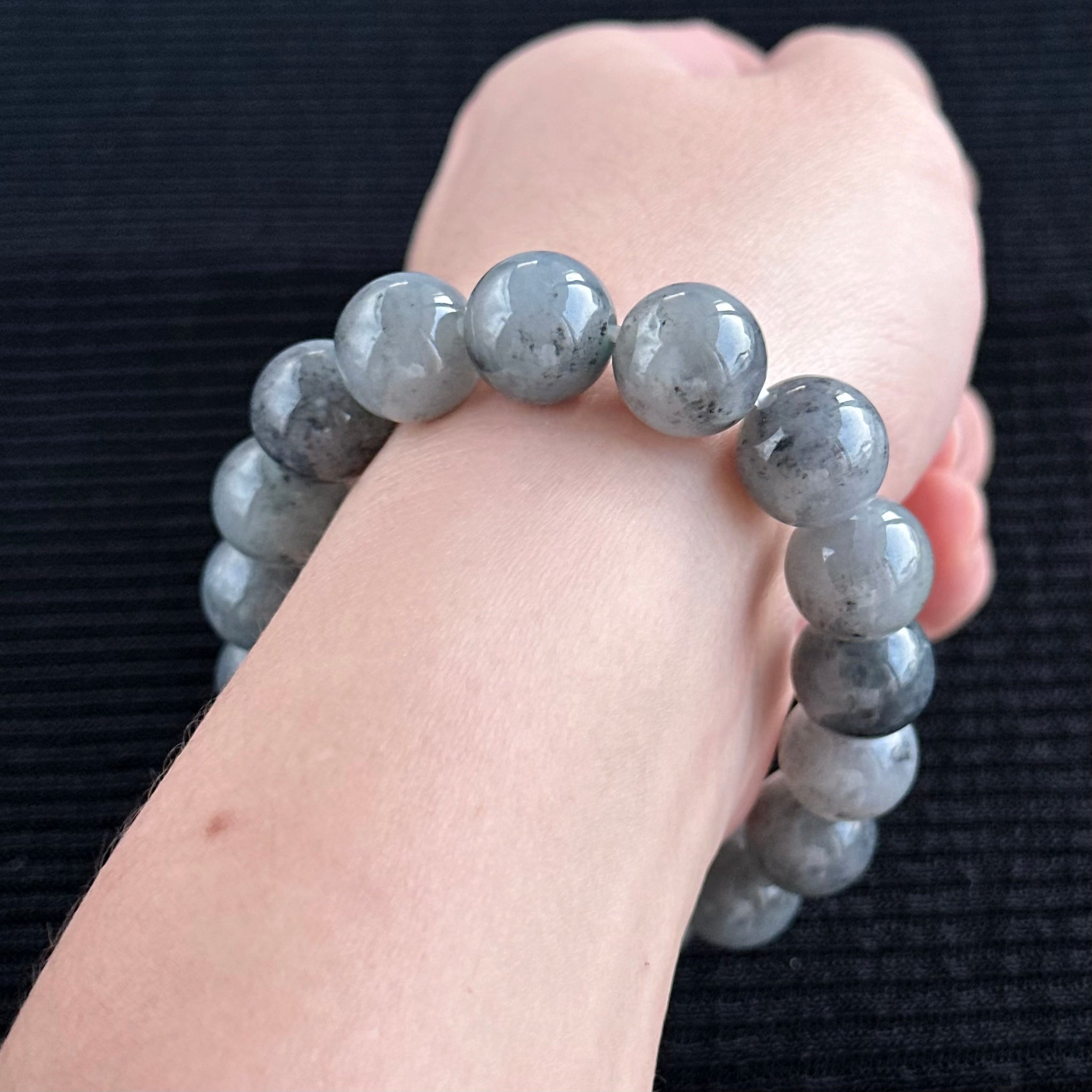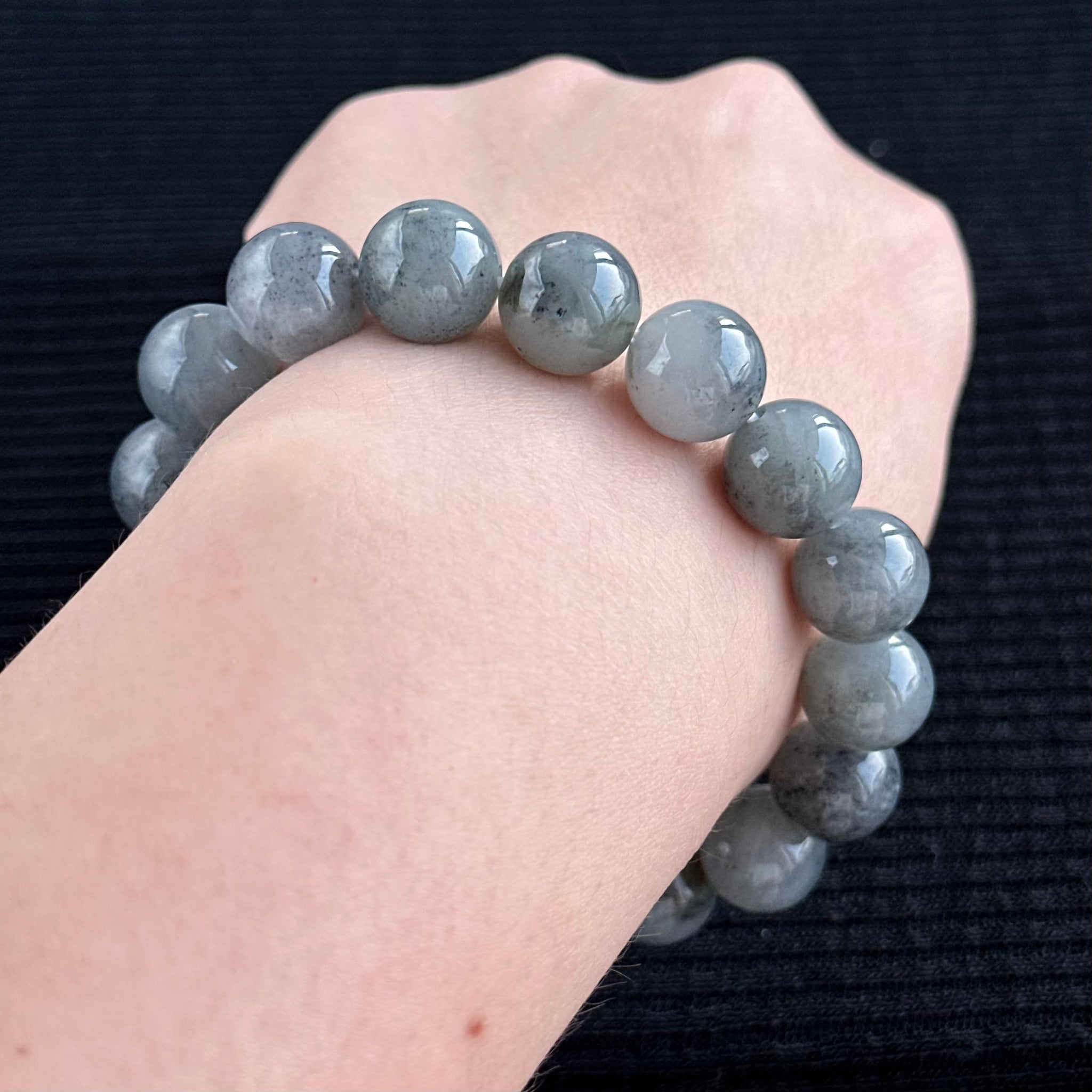 Like mountains rising through morning mists, this jadeite bracelet evokes a landscape both serene and majestic. Each 13mm bead is crafted from Wuji (乌鸡) jadeite, with soft gradients of silvery-grey interlaced by darker inclusions that drift like ink clouds across distant peaks. The natural contrasts create a contemplative, atmospheric beauty — subtle yet endlessly captivating.