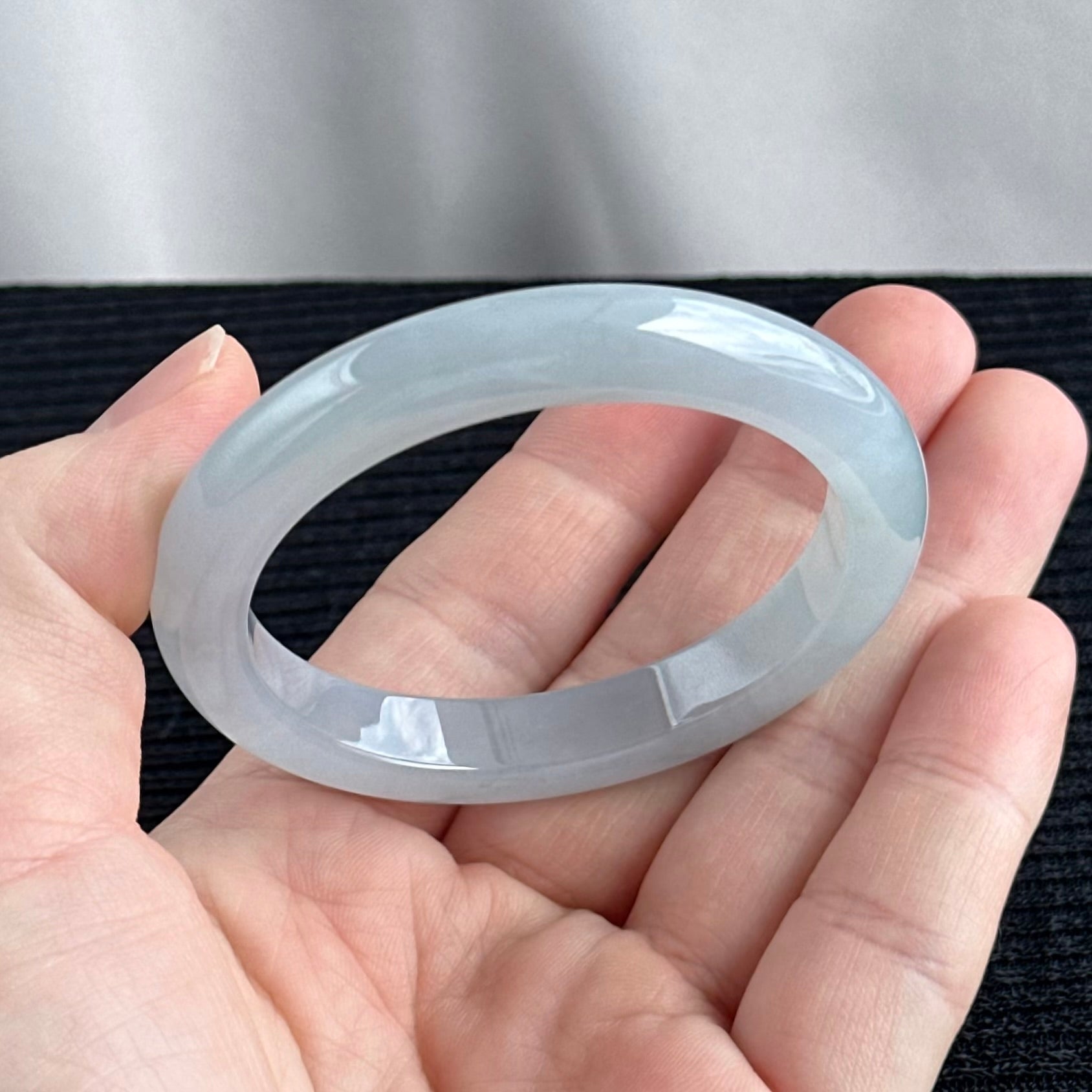 This jadeite bangle radiates an ethereal glow, shifting between icy white and soft moonlit blue as the light changes. In certain lighting, it reveals a delicate lavender hue — a rare and enchanting undertone caused by trace minerals within the stone. This interplay of colours gives the bangle a living, dreamlike quality. Its texture is ultrafine and velvety, plump like lychee flesh with the softness of a furong (芙蓉) base, enhancing both its tactile luxury and visual elegance.