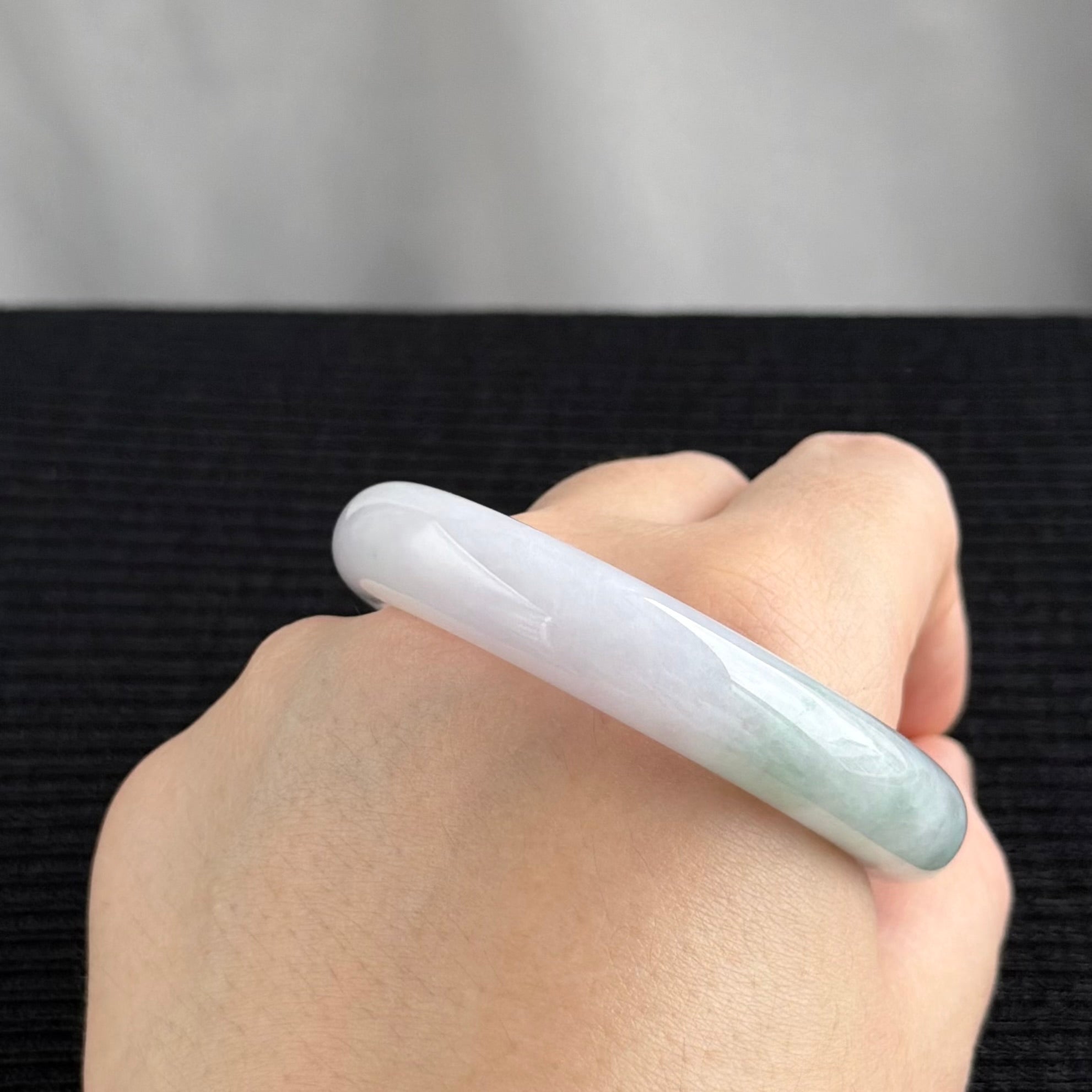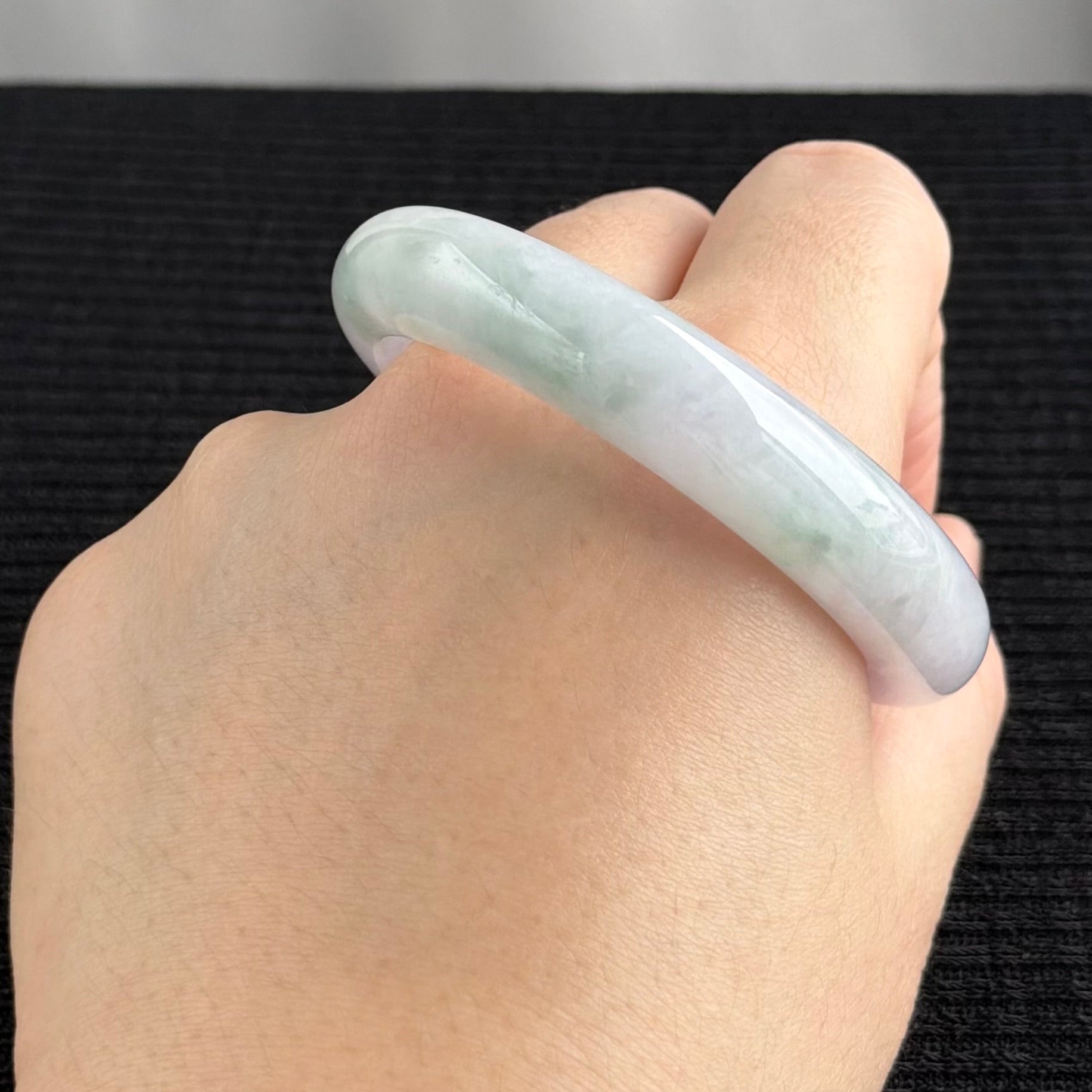 This jadeite bangle is a graceful expression of lavender mingled with soft jade green — a palette that evokes the first blush of morning. The icy lavender base glows with gentle translucency, while strokes of green flow through like tender vines awakening to daylight. Its body is smooth and luminous, with a fine, moisturized polish that enhances both its tactile quality and ethereal glow. A piece that feels quietly radiant, like petals opening to meet the sun.