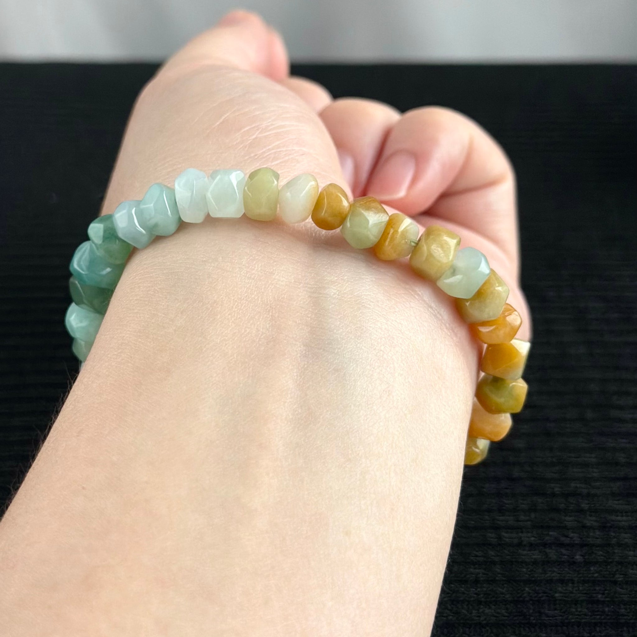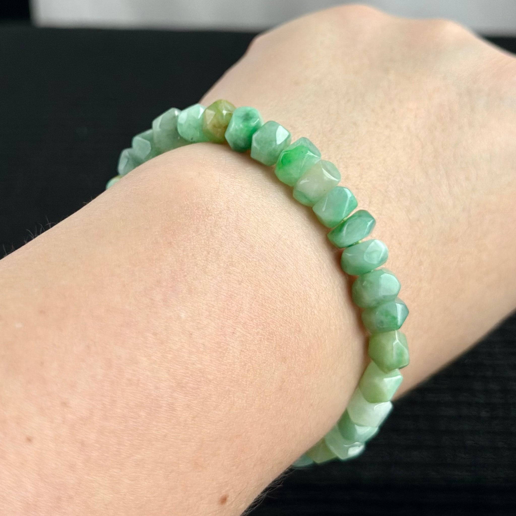 Each bead is hand-faceted with miniature pavilion-style cuts — echoing the underside of a diamond. This craftsmanship gives every piece a radiant shimmer and soft tactility, turning natural jade into something alive with light. Subtle colour transitions and organic facet variations make each bracelet truly one of a kind.