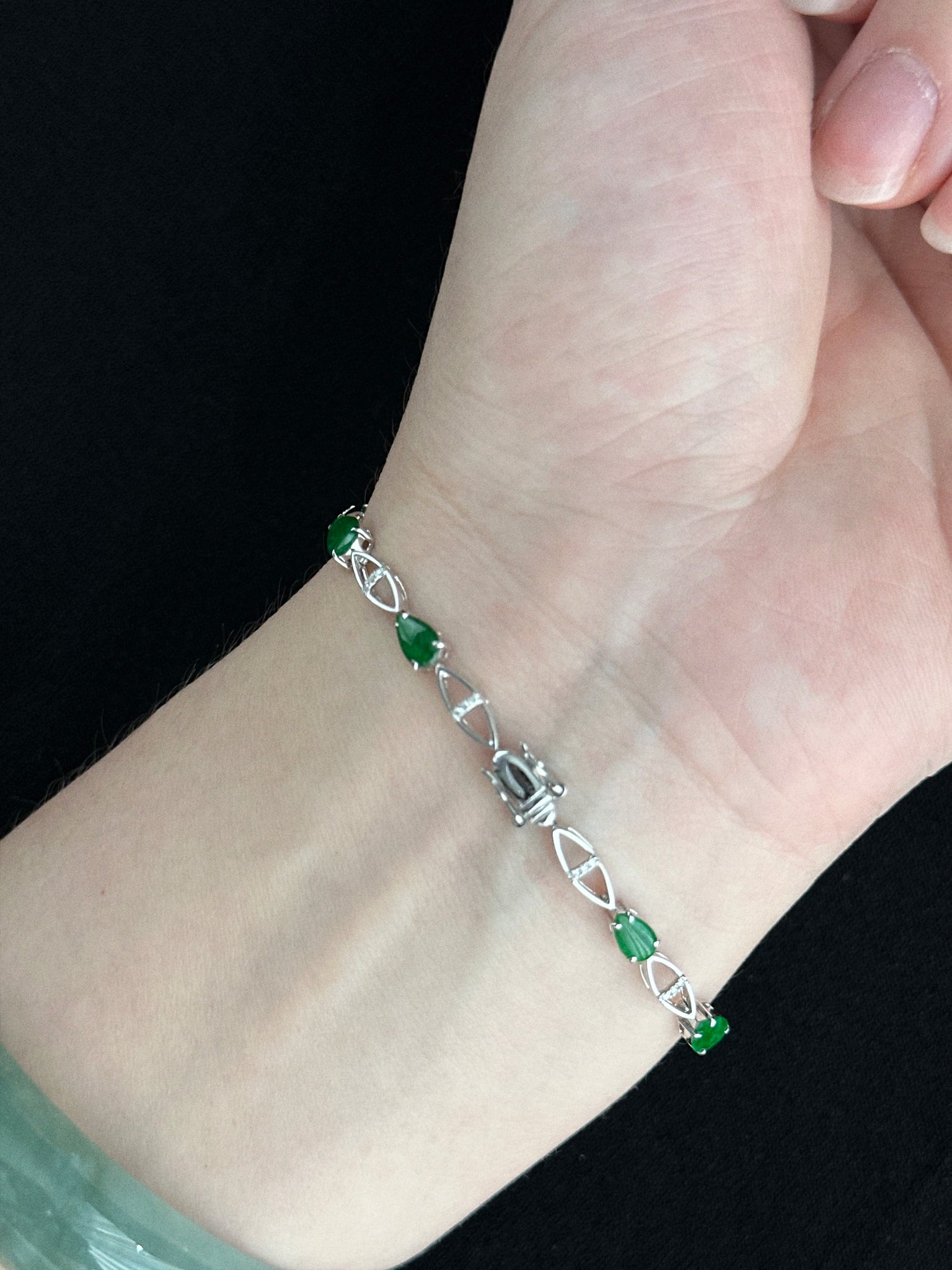 Between the jadeite gems, delicate marquise-shaped links in 18K white gold — accented with natural diamonds — bring a rhythmic lightness and refinement to the composition. The openwork design allows for movement and airiness, offering a refined contrast that elevates the bracelet’s design without detracting from the star — the jade itself.