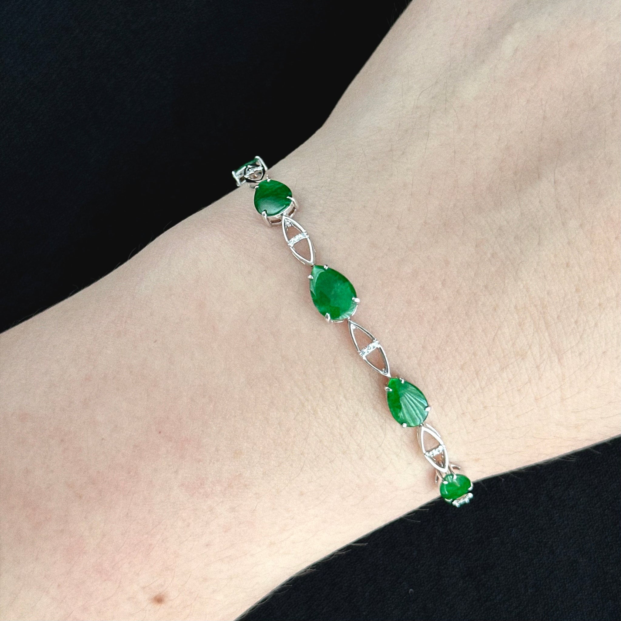 Crafted with precision in Hong Kong, this bracelet features a graceful stream of pear-shaped Type A jadeite cabochons in a vivid Imperial Green (帝王绿) hue —
