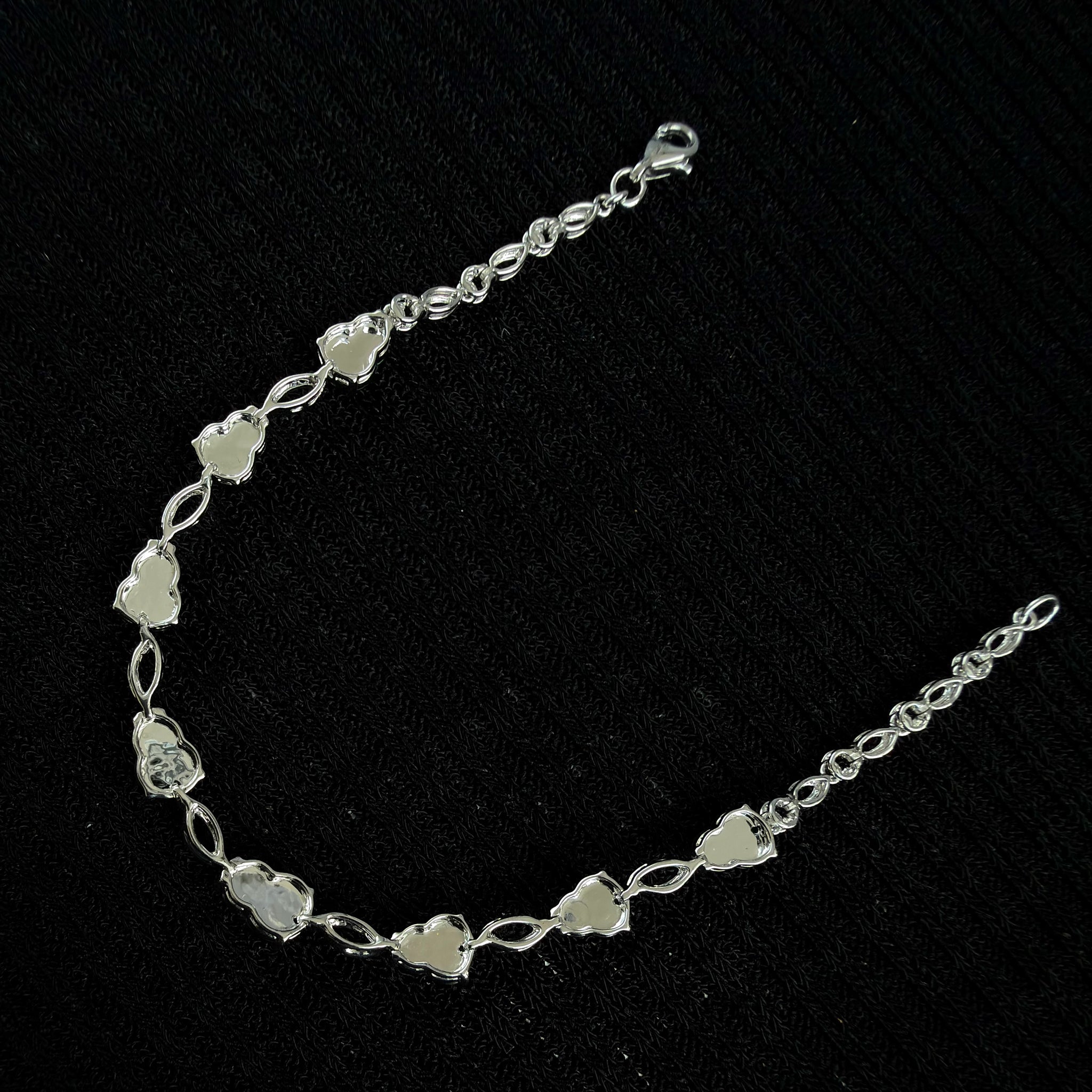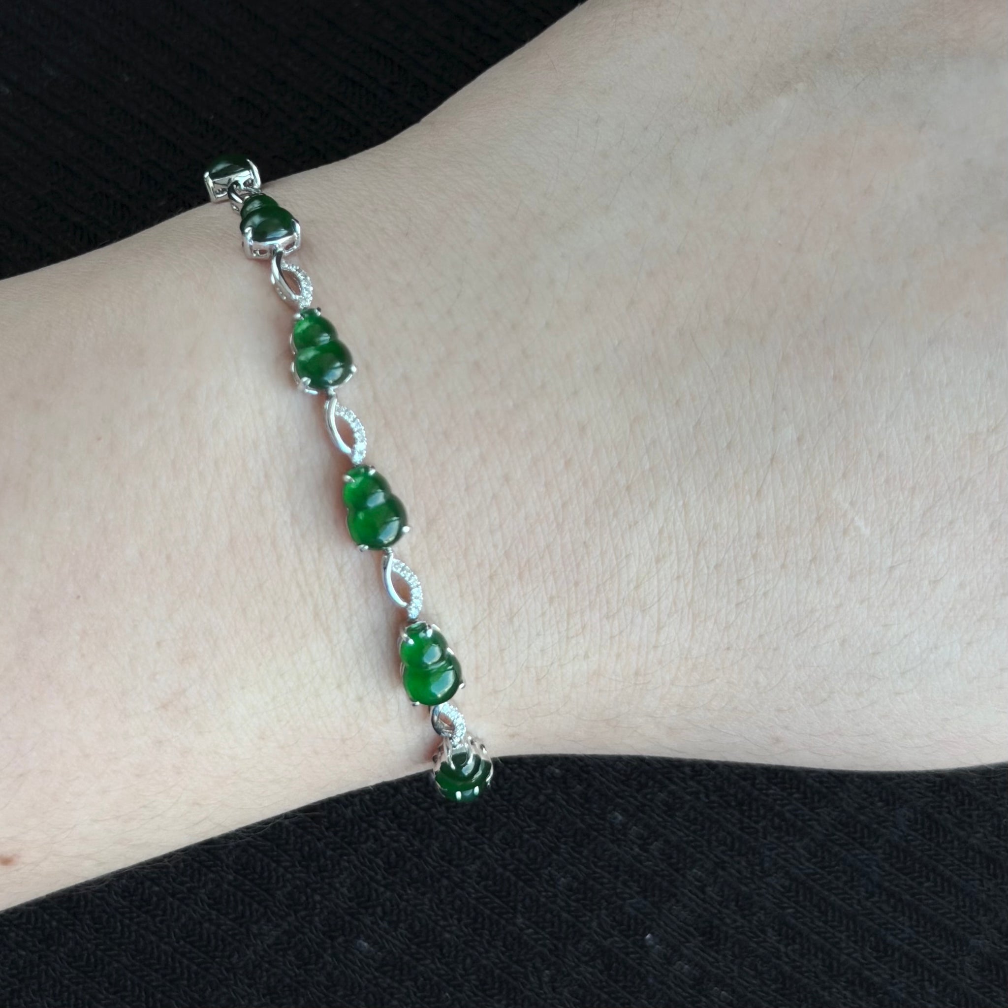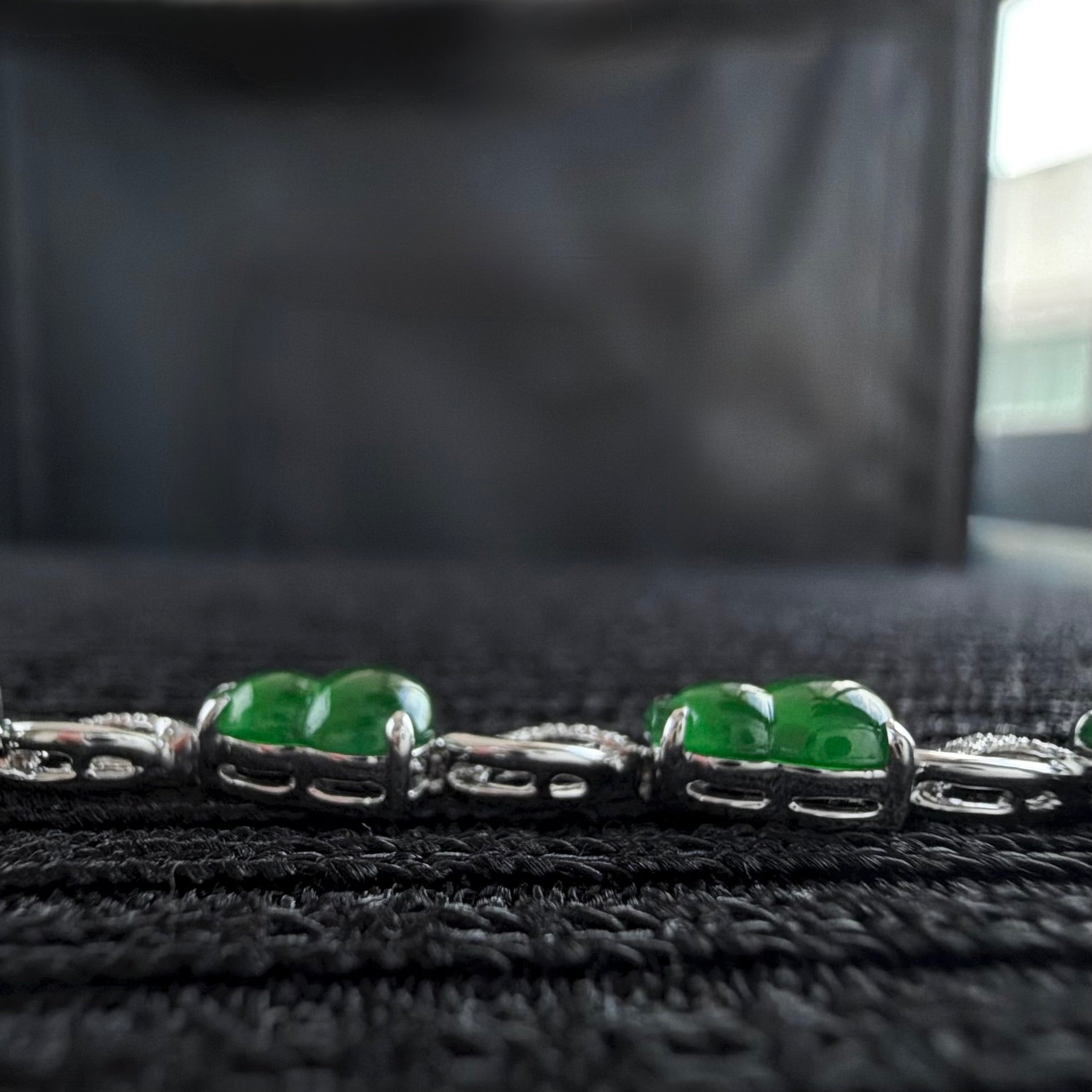 A strand of meticulously matched Type A jadeite gourds, each carved to capture the luminous glow of vivid green, forms the heart of this bracelet. The stones are interlinked with pavé-set infinity motifs in 18K white gold — a fluid rhythm of light and shadow that flows gracefully along the wrist. The translucency reveals quiet depths within each gourd, their polished surfaces reflecting vitality and elegance in equal measure.