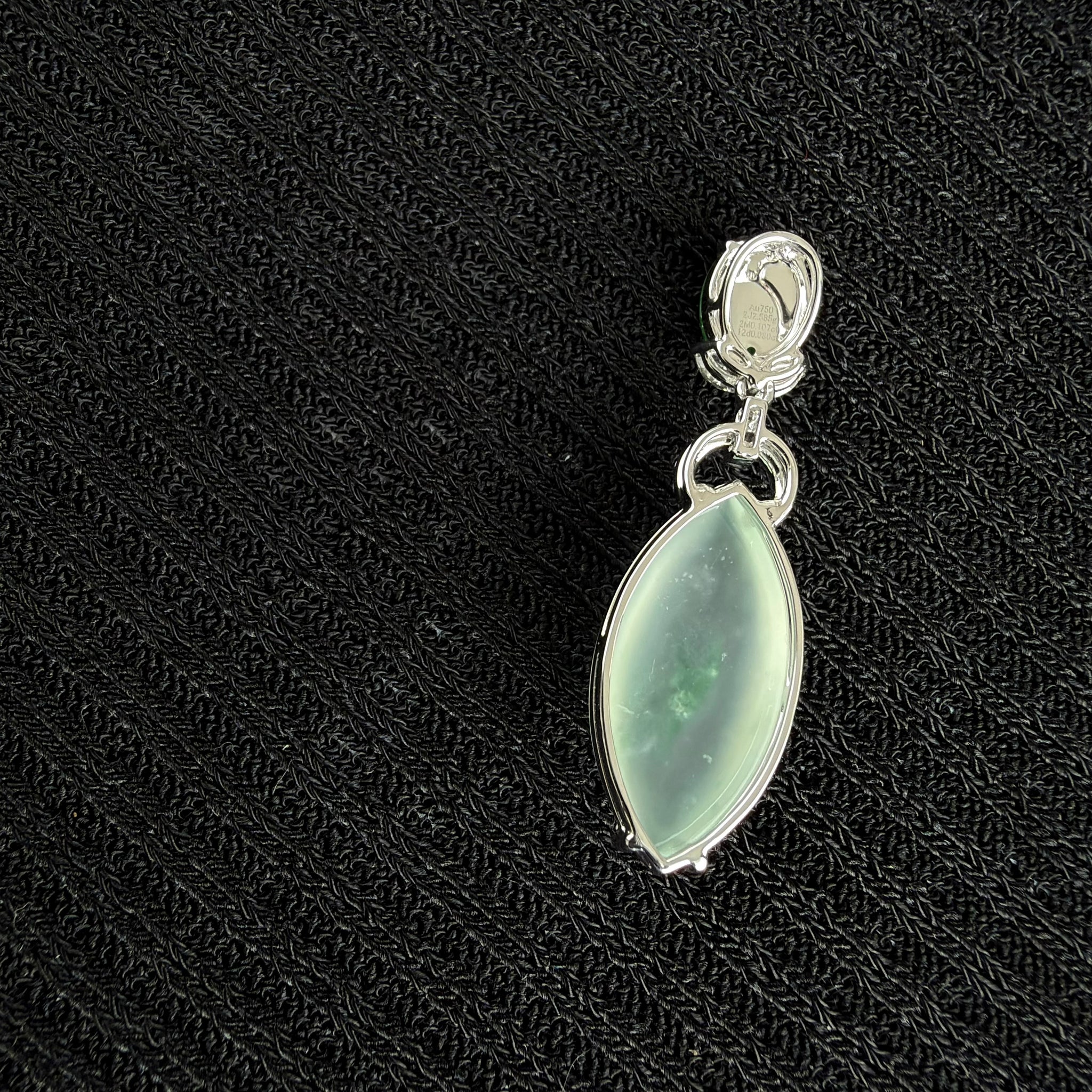 This pendant pairs a vivid green jadeite cabochon with an icy translucent jade body, connected by a circle of diamonds that glimmers like ripples on still water. The marquise-shaped jade is serene and luminous, holding within it a soft wisp of green that floats like a reflection caught beneath the surface. Together, they evoke the stillness of a lake at dawn — clear, profound, and quietly alive.